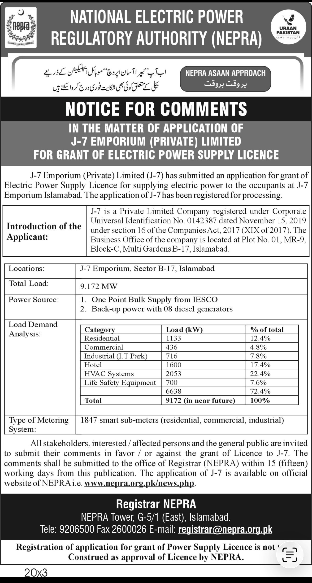 Notice for Comments in the matter of application of J-7 Emporium (Private) Limited for grant of Electric Power Supply Licence | View |