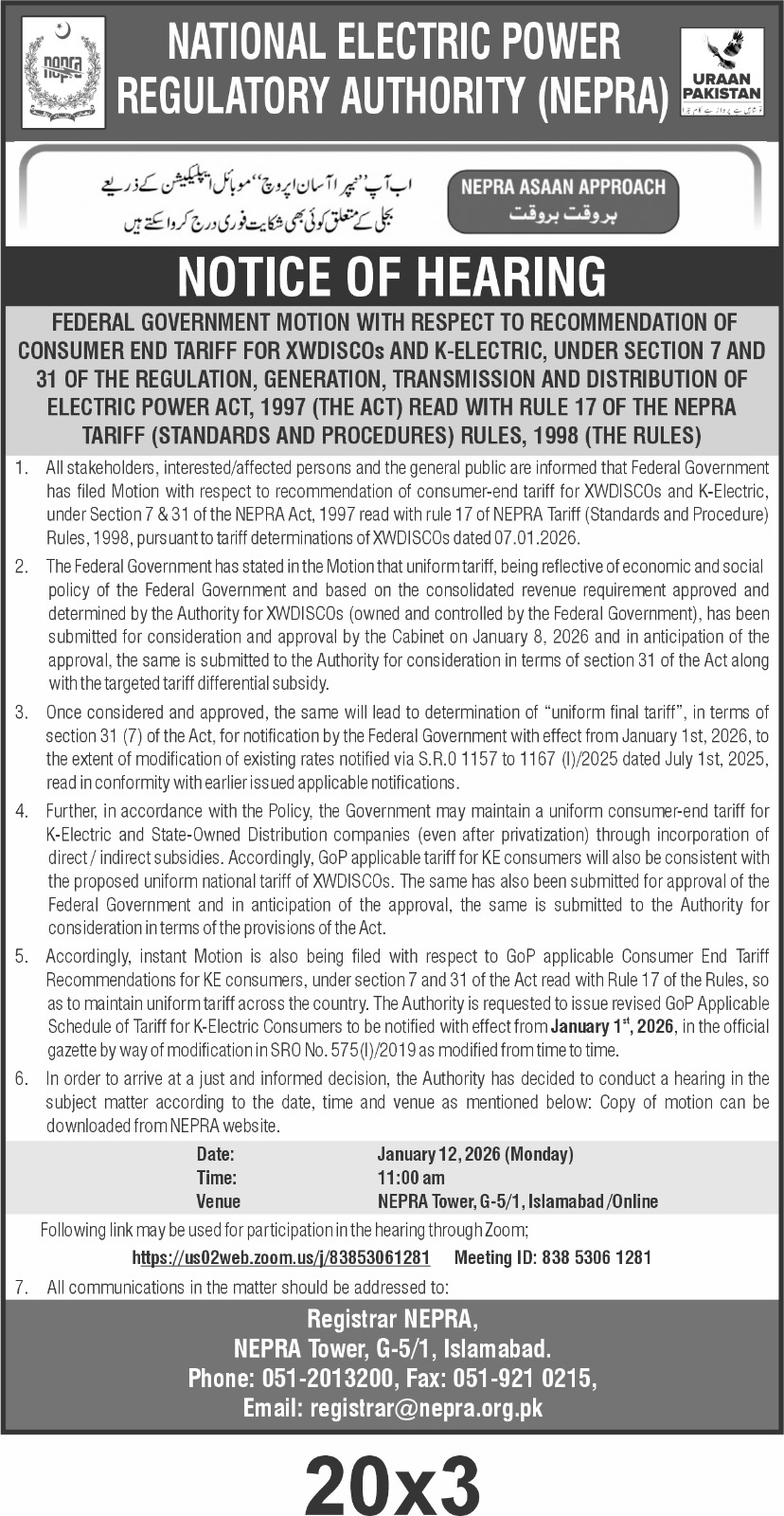 Public Hearing regarding Federal Government Motion with respect to Recommendation of Consumer End Tariff for XWDISCO and K-Electric, under Section 7 and 31 of NEPRA Act read with Rule 17 of the NEPRA Tariff (Standards and Procedures) Rules, 1998 (The Rules) | |