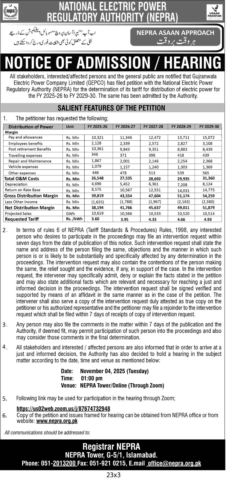 Notice of Admission/ Hearing - All stakeholders, interested/ affected persons and the General Public are notified that GEPCO has filed petition with NEPRA for the determination of its tariff for Distribution of electric power for the FY 2025-26 to FY 2029-30. The same has been admitted by the Authority | View |