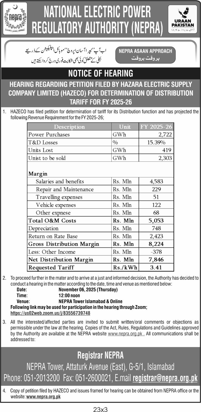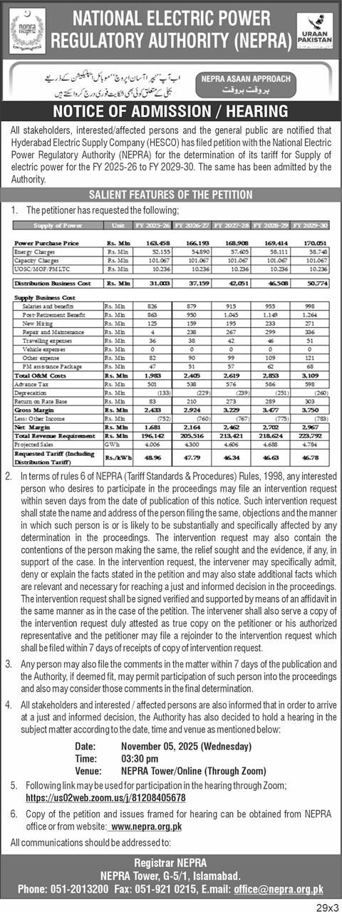 All stakeholders, interested/ affected persons and the General Public are notified that HESCO has filed petition with NEPRA for the determination of its tariff for Distribution of electric power for the FY 2025-26 to FY 2029-30. The same has been admitted by the AuthorityAdvertisement -