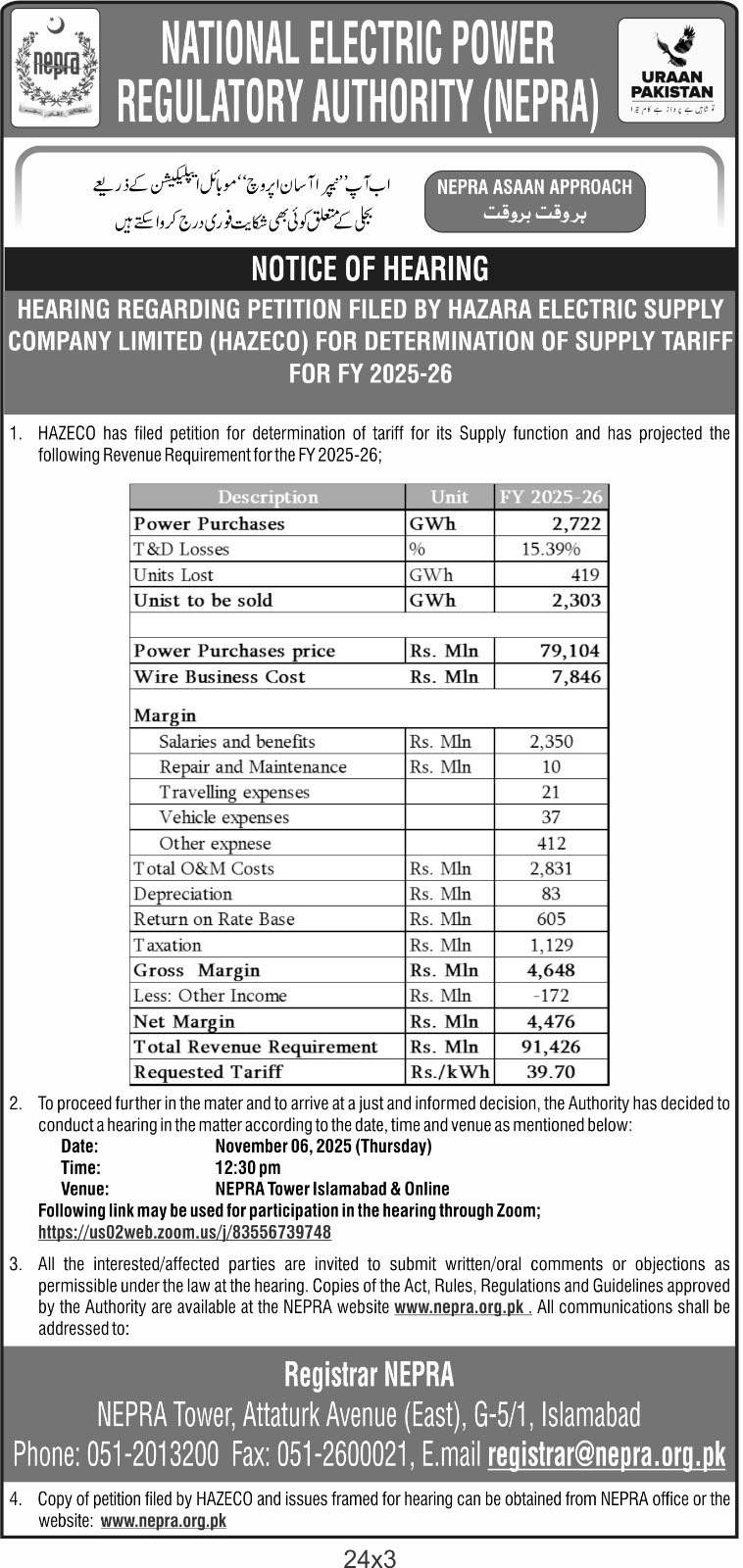 Hearing regarding Petition filed by HAZECO for Determination of Supply Tariff for FY 2025-26Advertisement -
