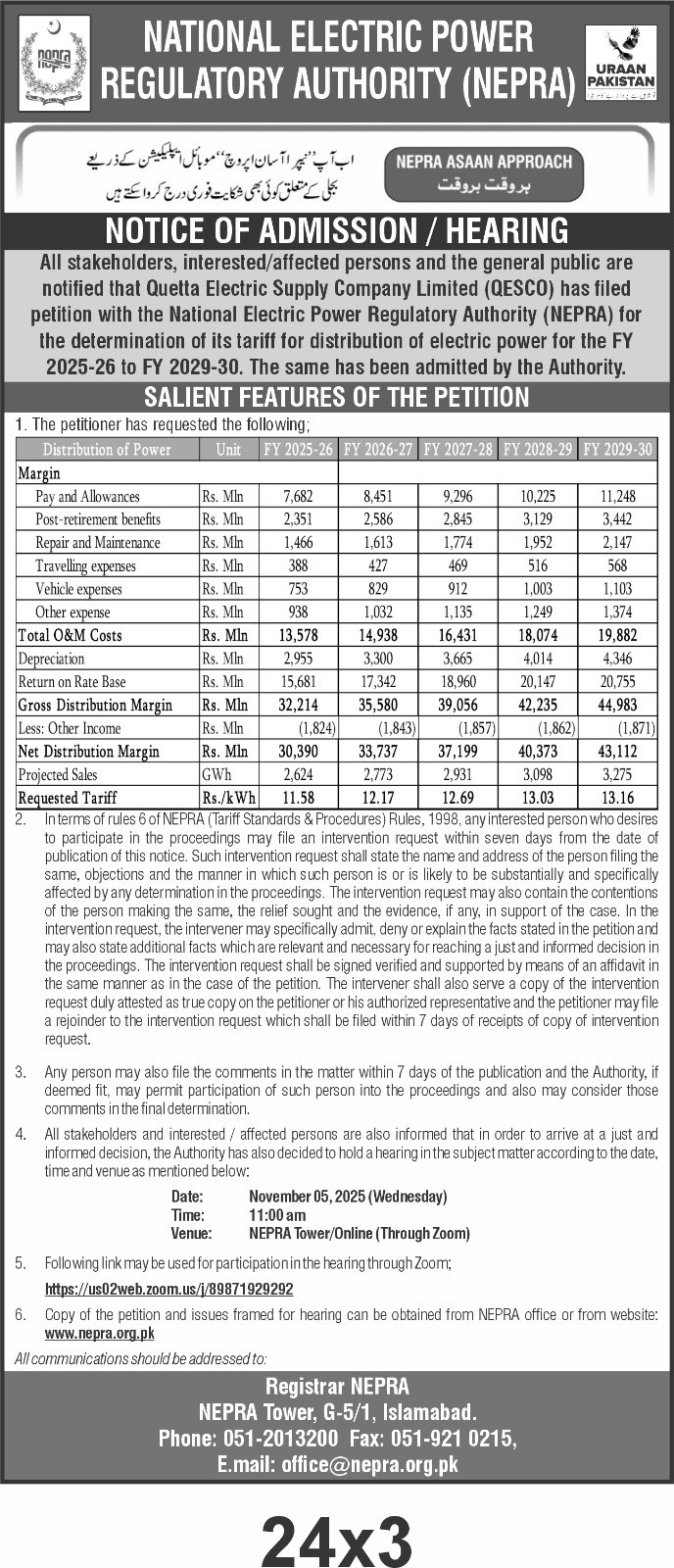 All stakeholders, interested/ affected persons and the General Public are notified that QESCO has filed petition with NEPRA for the determination of its tariff for Distribution of electric power for the FY 2025-26 to FY 2029-30. The same has been admitted by the AuthorityAdvertisement -