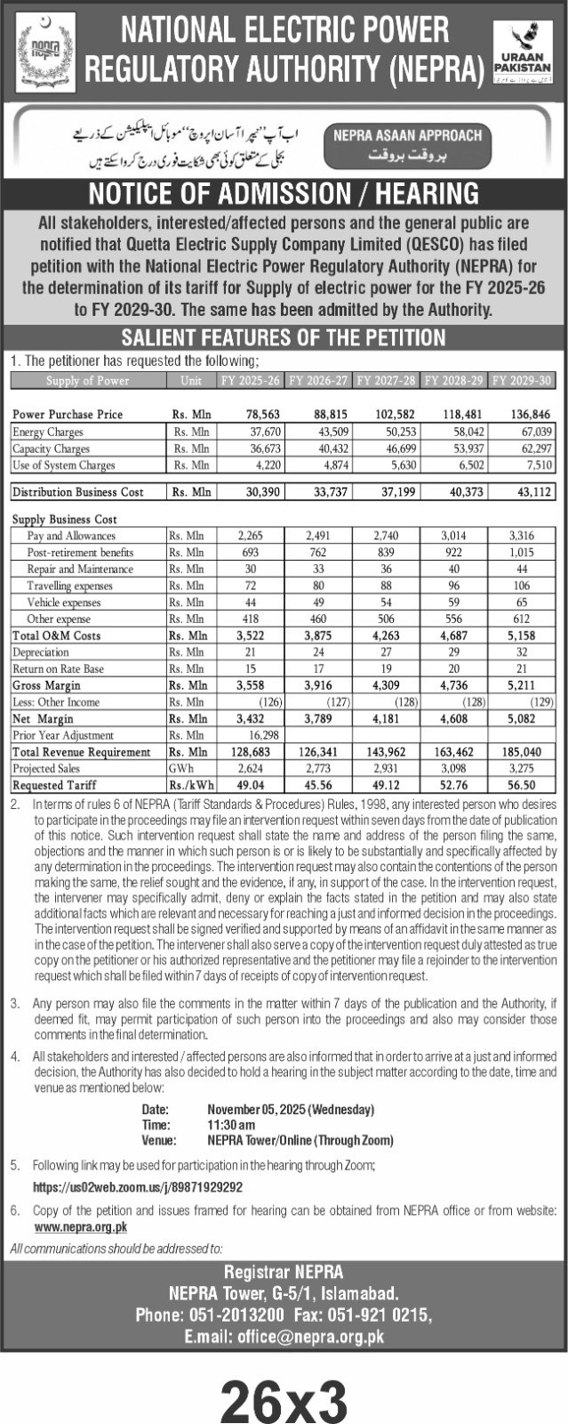 Notice of Admission/ Hearing - All stakeholders, interested/ affected persons and the General Public are notified that QESCO has filed petition with NEPRA for the determination of its tariff for distribution of electric power for the FY 2025-26 to FY 2029-30. The same has been admitted by the Authority | View |