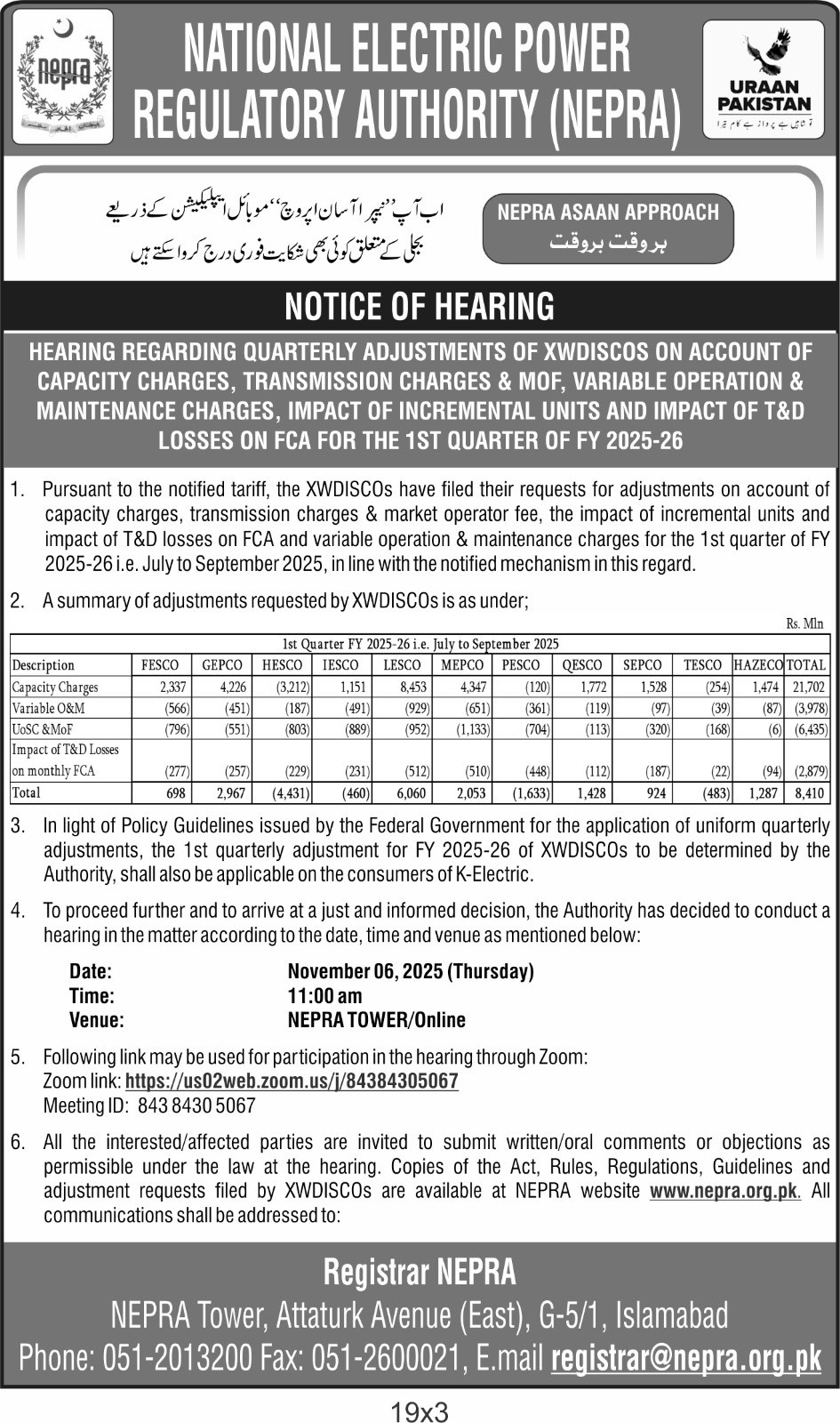 Hearing regarding Quarterly Adjustments of XWDISCOs on account of Capacity Charges, Transmission Charges & MOF, Variable Operation & Maintenance Charges, Impact of Incremental Units and Impact of T&D Losses on FCA for the 1st uarter of FY 2025-26Advertisement -