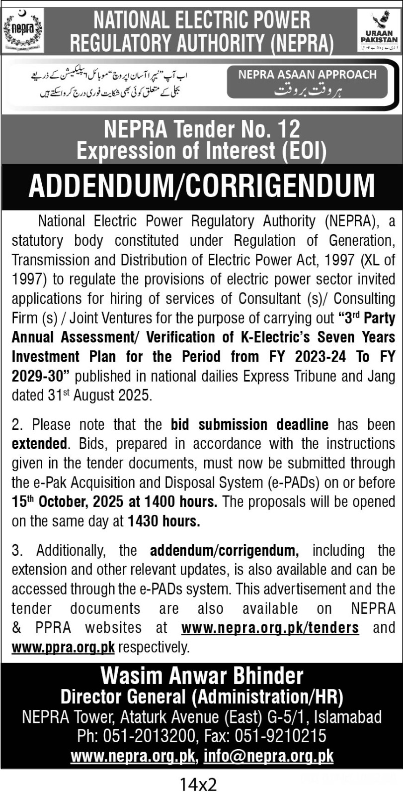NEPRA Tender No. 12/2025 - Expression of Interest (EOI) - Hiring of Services of Consultant (s)/ Consulting Firm (s) / Joint Ventures for the purpose of carrying out “3rd Party Annual Assessment/ Verification of K-Electric’s Seven Years Investment Plan for the Period from FY 2023-24 To FY 2029-30” |