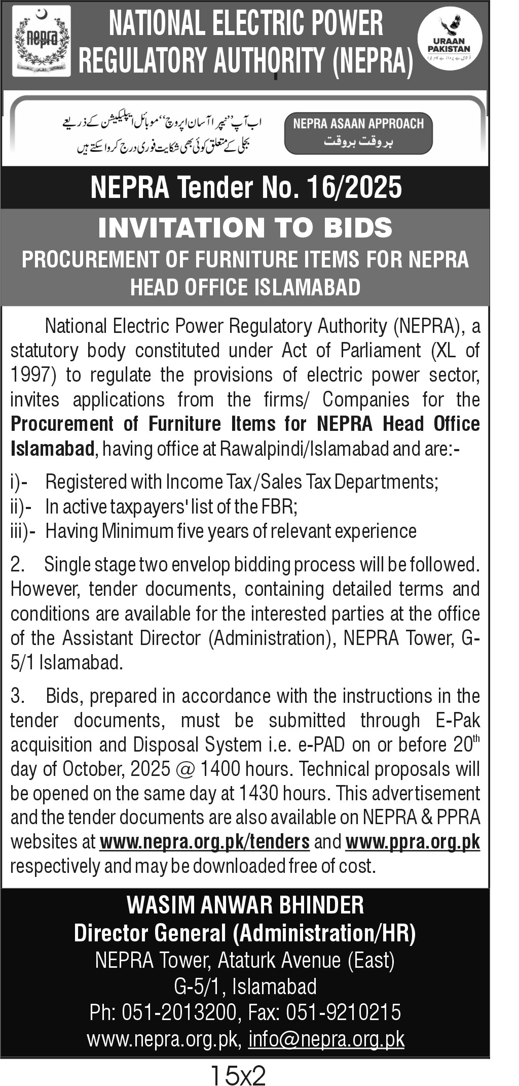 Tender No. 16/2025 - Invitation for Bids - Procurement of Furniture Items for NEPRA Head Office Islamabad |