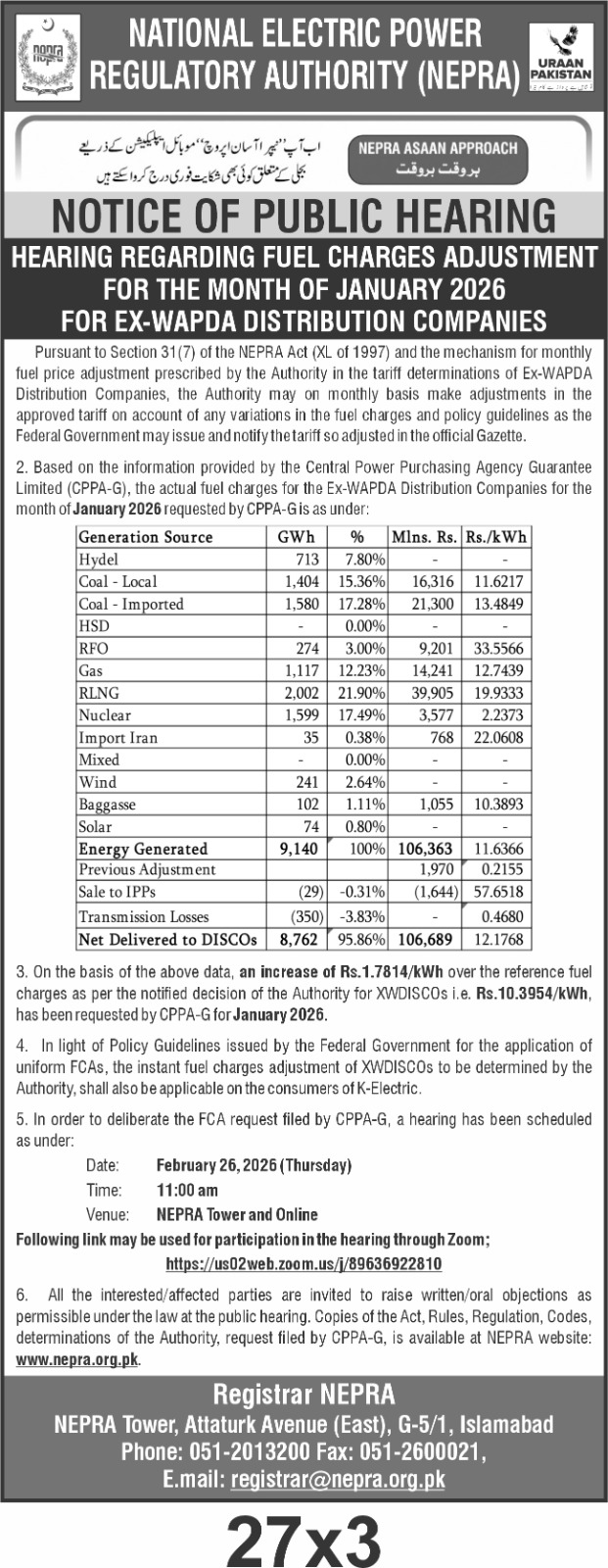 Hearing regarding Fuel Charges Adjustment for the month of January 2026 for EX-WAPDA Distribution CompaniesAdvertisement