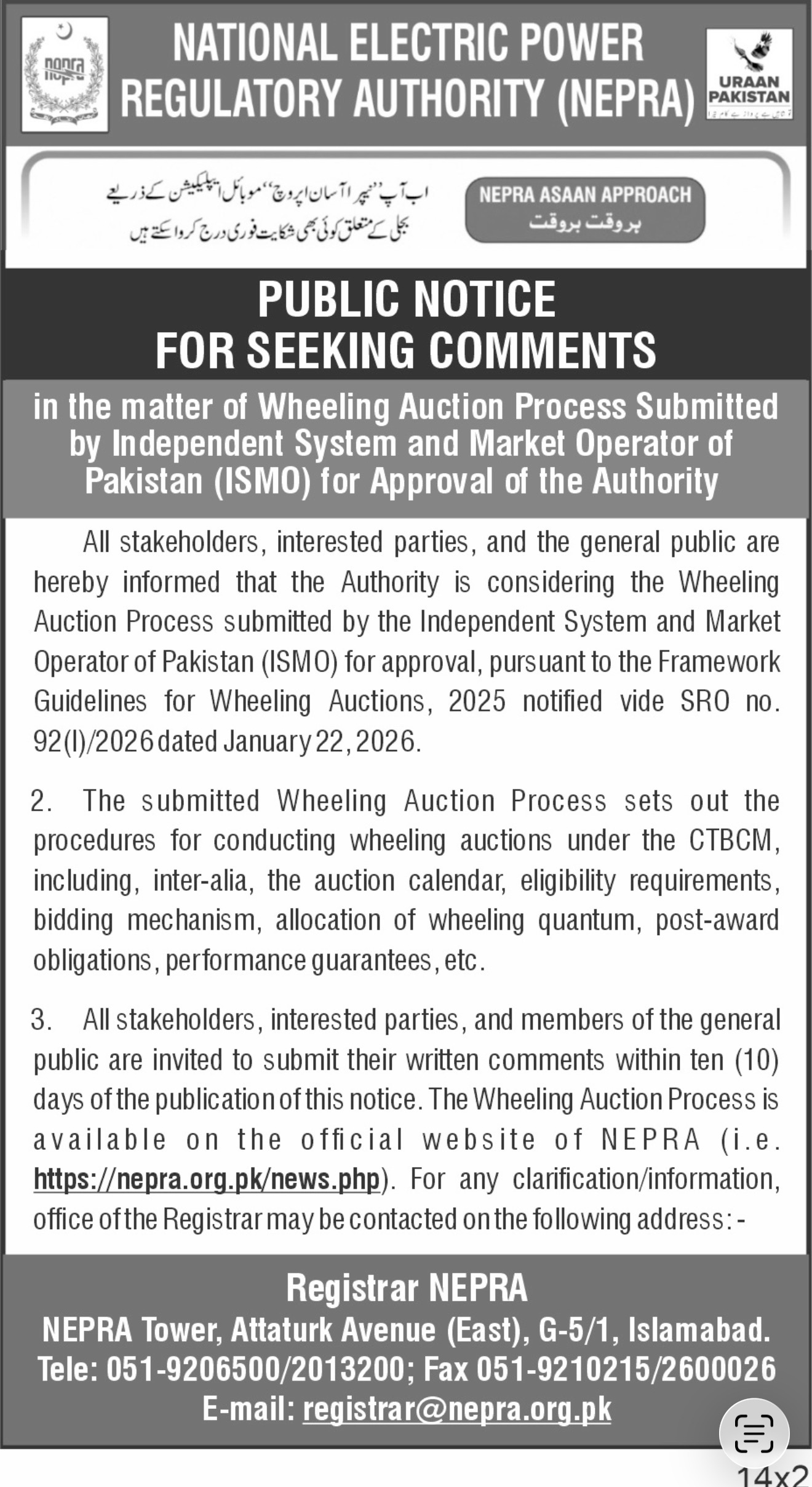 Public Notice for Seeking Comments in the matter of Wheeling Auction Process submitted by Independent System and Market Operator of Pakistan (ISMO) for approval of the Authority | View |